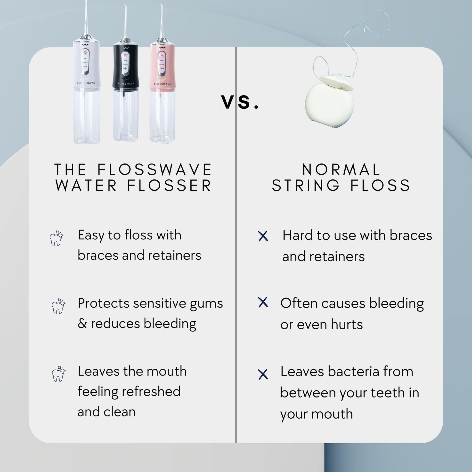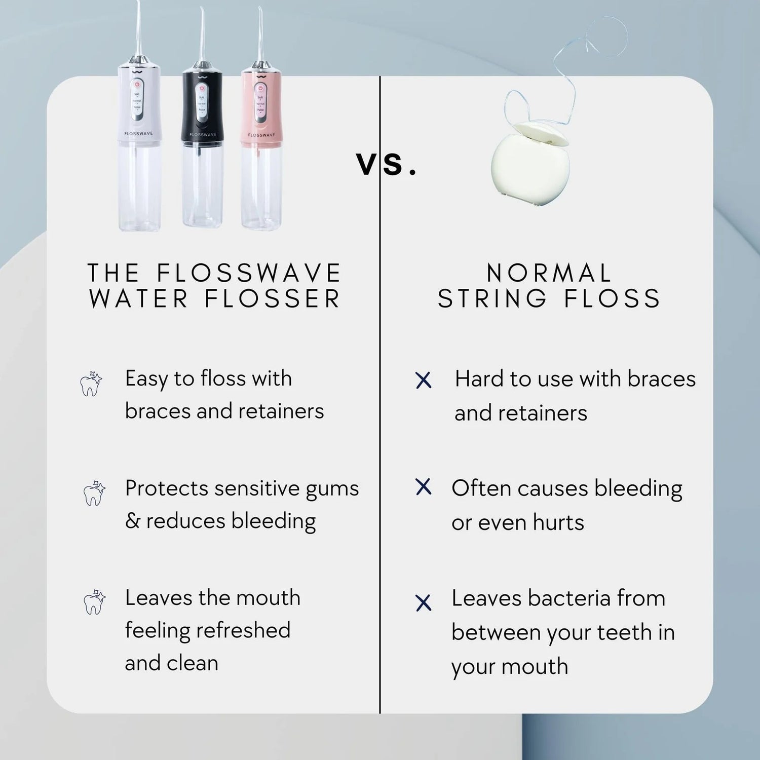 The reasons why we and our customers love The Water Flosser over traditional floss.